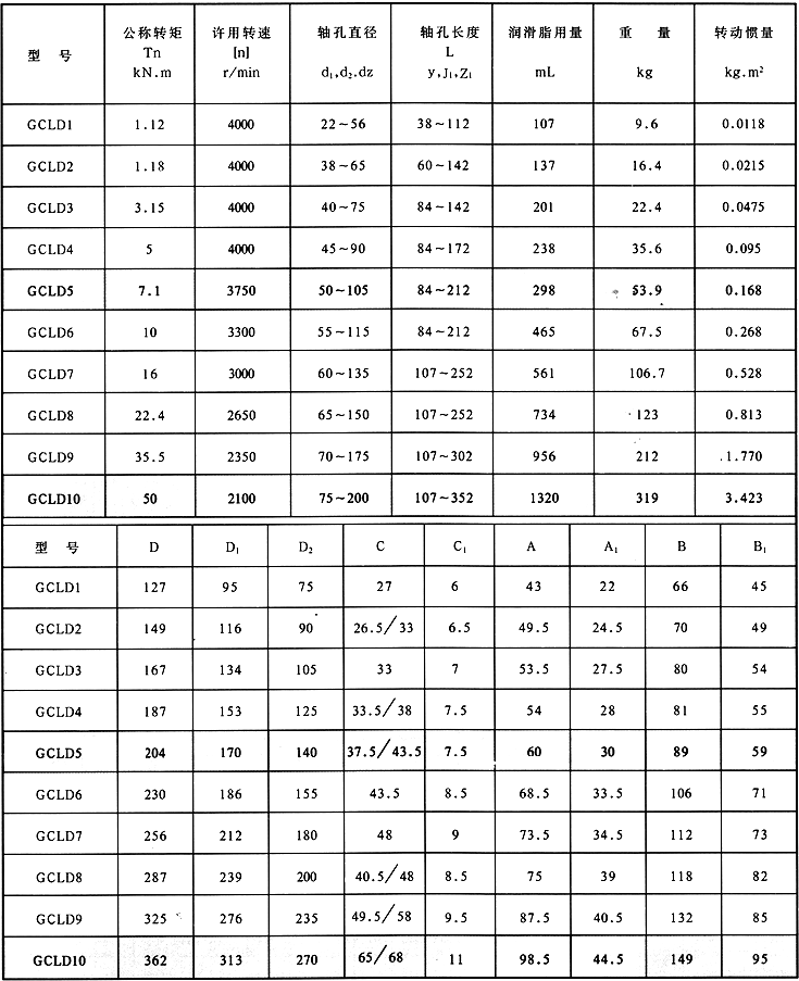 本联轴器适用于联接电机与机械两水平轴线传动轴系,具有一定角向补偿两轴相对偏移性能的鼓形齿式联轴器,工作环境温度-20~+80℃,传递公称转矩为1.12~50KN·m。 GCLD型 联轴器参数与尺寸(mm)